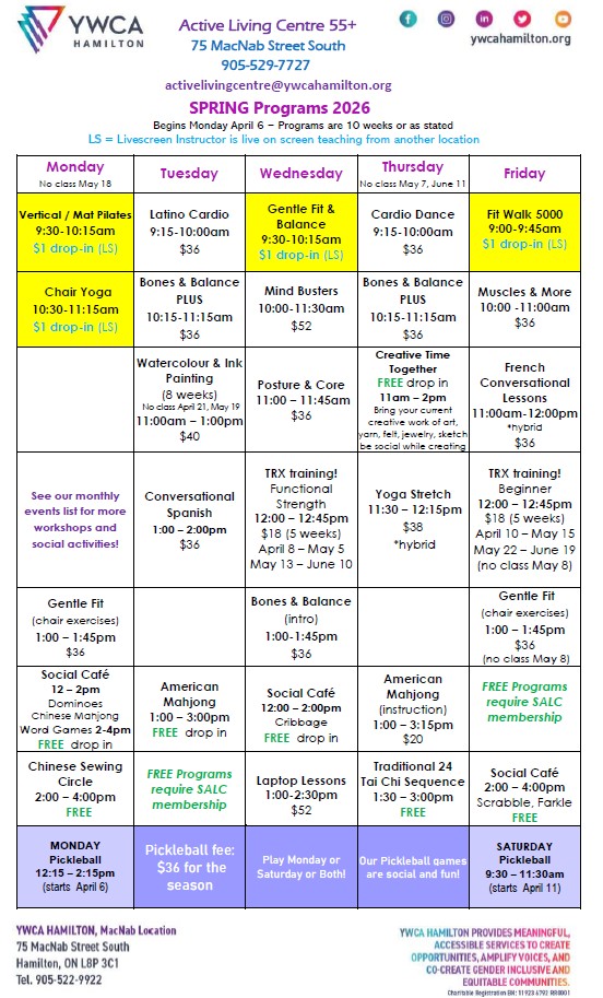 Spring Schedule for Seniors Active Living Centre